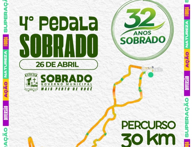 A cidade de Sobrado se prepara para mais uma grande celebração esportiva. No próximo dia 26 de abril de 2026, será realizado o 4º Pedala Sobrado, dentro da programação comemorativa pelos 32 anos de emancipação política do município, com organização e apoio da Secretaria Municipal de Esportes, fortalecendo também o turismo de aventura na região.