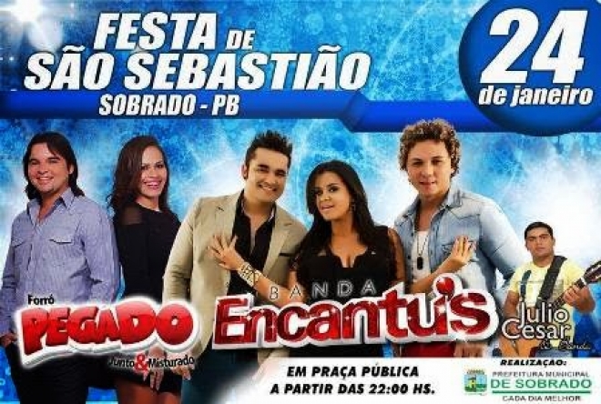 A prefeitura de Sobrado realizará a festa de São Sebastião nesta sexta-feira, 24 de janeiro. O evento contará com os shows das bandas Forró Pegado e Encantu's. "Convidamos os amigos e amigas de Sobrado e região para participar de nossa festa de São Sebastião. Venham que estaremos de braços abertos para recebê-los", disse o prefeito George Coelho, que vem realizando um trabalho sério e voltado para os mais carentes daquele município.