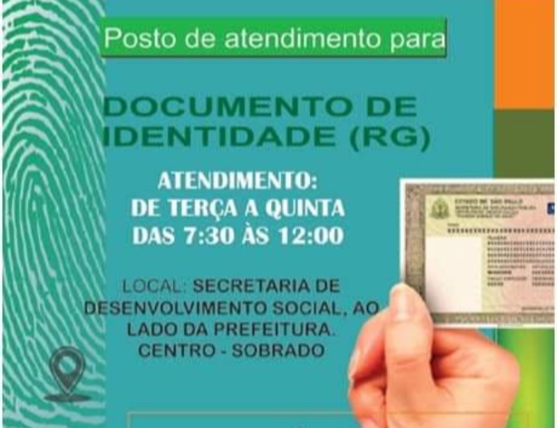A Prefeitura Municipal de Sobrado, por meio da Secretaria de Desenvolvimento Social, em parceria com o Instituto de Polícia Científica (IPC), inicia nesta terça-feira, dia 26 de Outubro, a emissão de Identidades (RG) no município de Sobrado.