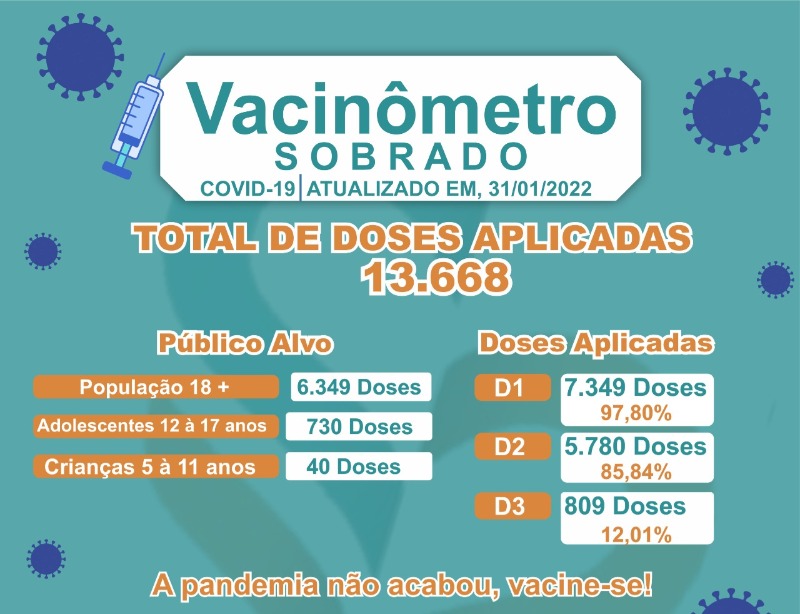 Dados divulgados pela Secretaria de Saúde de Sobrado indicam que 13.668 doses de vacinas contra a Covid-19 já foram aplicadas na população. O número considera o período desde o início da campanha de imunização até a última segunda-feira (31).