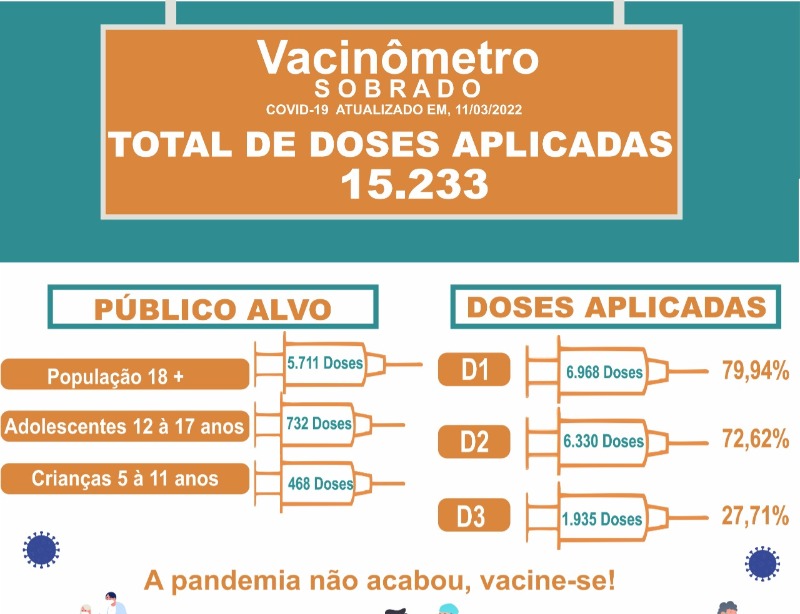 Segundo a Secretaria de Saúde de Sobrado 15.233 doses das vacinas contra a Covid-19 já foram utilizadas para aplicação na população. A informação foi divulgada nessa sexta-feira (11).