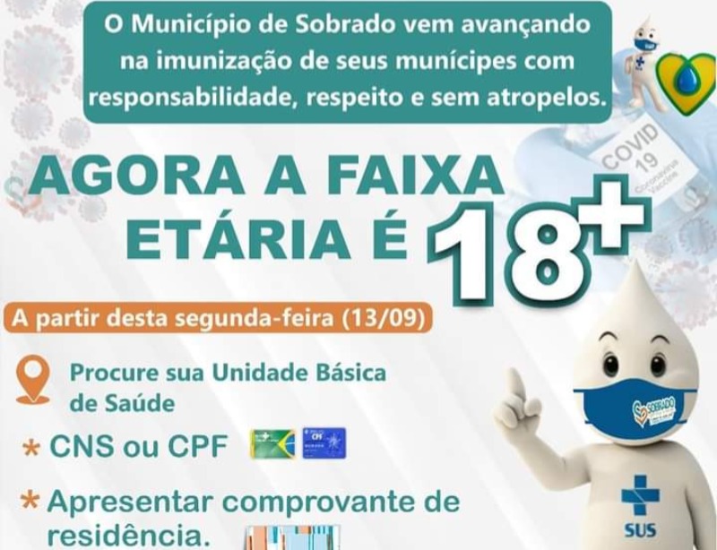 A Secretaria de Saúde de Sobrado inicia na segunda-feira (13) a aplicação da primeira dose da vacina contra a Covid-19 em pessoas com 18 anos ou mais.