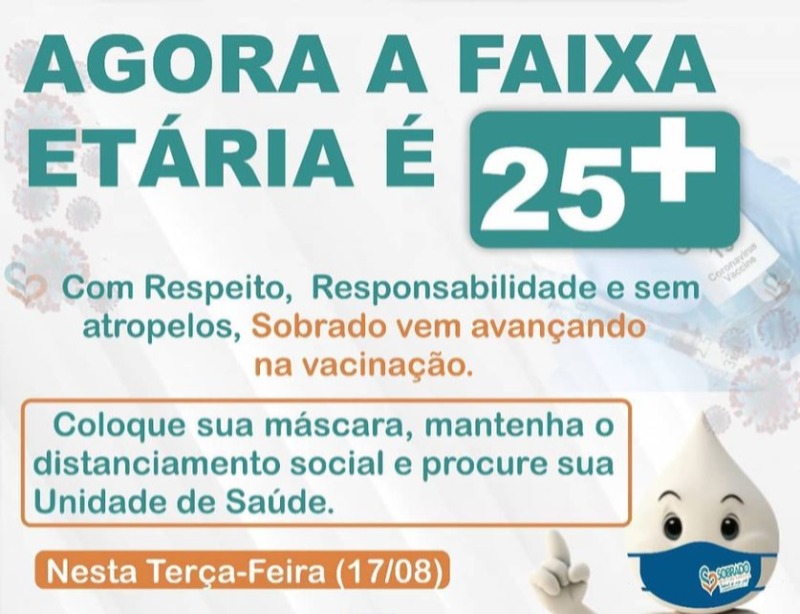Nesta terça-feira (17) a Prefeitura de Sobrado, através da Secretaria de Saúde, iniciou a imunização de pessoas com 25 anos ou mais contra a Covid-19. A inclusão da nova faixa etária no cronograma de vacinação elaborado pelo Município.