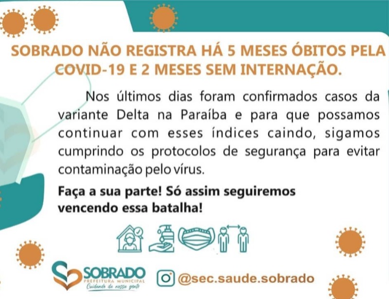 A secretaria de Saúde do Município de Sobrado lançou um alerta a população sobre o avanço da variante Delta do novo coronavírus no estado da Paraíba, orientando a todos para que continuem com os cuidados com o uso de máscara, álcool em gel e distanciamento social.