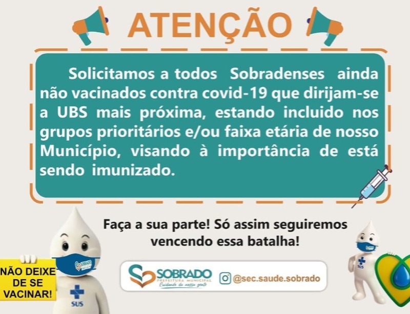 A secretaria de Saúde faz ainda um apelo a população para que se vacinem, tendo em vista que, a imunização é a principal forma de combater a proliferação do vírus e evitar casos graves da doença. A orientação é que todo sobradense, ainda não vacinado, se dirija a UBS mais próxima , caso estejam dentro das faixas etárias indicadas ou faça parte dos grupos prioritários.