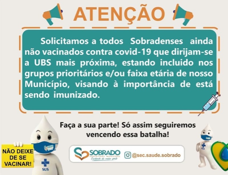 A Secretaria de Saúde do município de Sobrado lançou uma nota na última terça-feira, dia 7 de Setembro, convocando todos os munícipes, que ainda não tomaram a vacina contra a Covid-19, que se façam presentes aos postos de saúde mais próximo para receberem a sua dose do imunizante.
