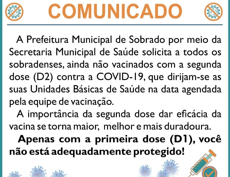 A secretaria de Saúde do município de Sobrado faz um alerta e apela a toda população sobre a importância de tomar a segunda dose da vacina contra a Covid-19.