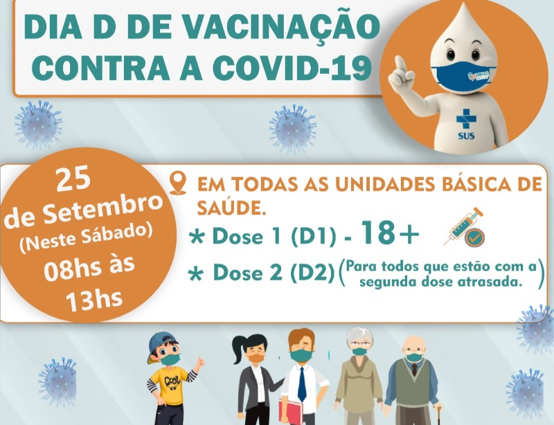 No próximo sábado, dia 25 de Setembro, a secretaria de Saúde do município de Sobrado vai realizar o dia D de Vacinação contra a Covid-19, com a aplicação da primeira dose para pessoas maiores de 18 anos e com a vacinação para todas as pessoas que estão com a segunda dose em atraso, tendo em vista que o nosso organismo só adquire a imunidade total contra a Covid-19 depois da aplicação da segunda dose da vacina.