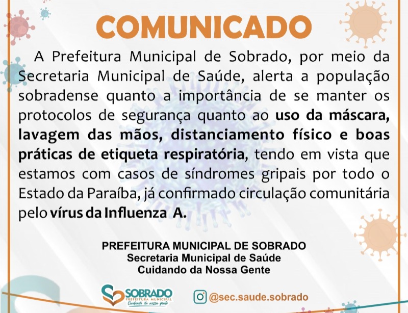 Secretaria de Saúde de Sobrado faz novo alerta a população sobre o coronavírus e a circulação do vírus da gripe