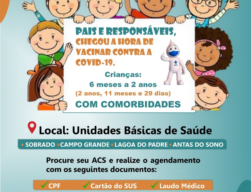 A Secretaria de Saúde de Sobrado iniciou a aplicação de vacinas contra a Covid-19 em crianças com seis meses a dois anos de vida com comorbidades. A disponibilidade das doses ocorre após recomendação do Ministério da Saúde e tem a finalidade de reforçar a cobertura vacinal contra a transmissão e os efeitos grave da doença.