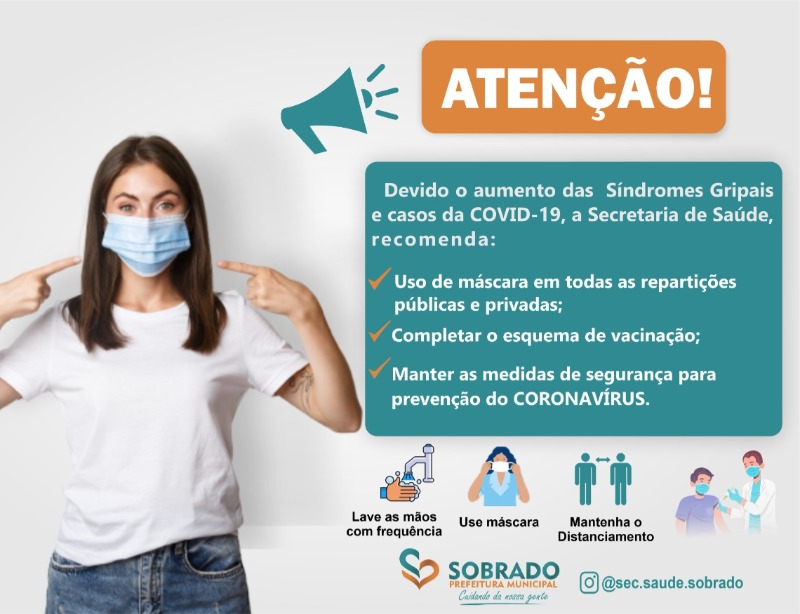 Em decorrência do aumento de casos de síndromes gripais, assim como Covid-19 em todo o país o uso de máscara facial passou a ser obrigatório em todas as repartições públicas de Sobrado. A medida tem a finalidade de reduzir os riscos de transmissão e surgimento de novos casos.