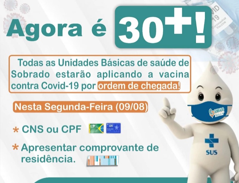 Nesta segunda-feira, dia 9 de Agosto, a secretaria de Saúde do município de Sobrado segue avançando na vacinação contra a Covid-19 e realizará a imunização da população com 30 anos de idade ou mais.