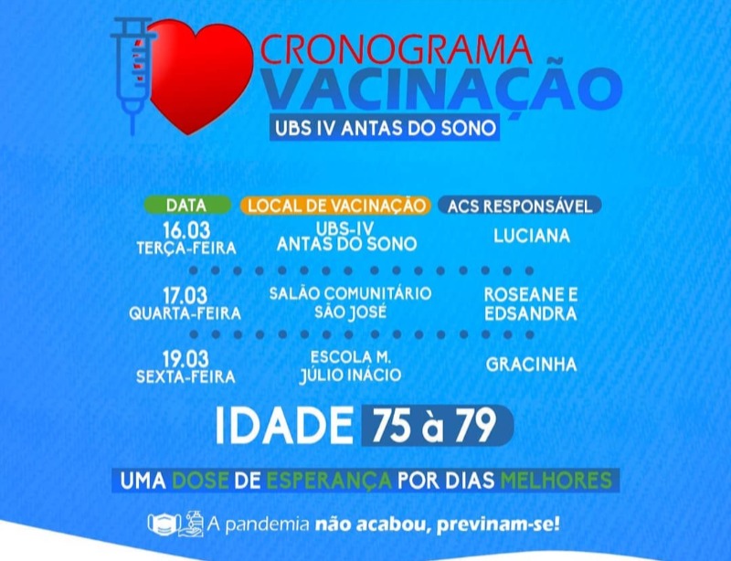 Conforme o cronograma, durante os dias 16, 17 e 19 de março a vacinação contra a Covid-19 estará sendo realizada na UBS IV – na localidade de Antas do Sono; e no Salão Comunitário São José; e Escola M. Júlio Inácio.