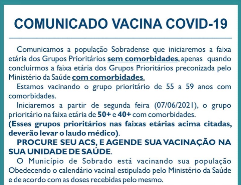 A vacinação contra o novo coronavírus em pessoas com comorbidades continua avançando no município de Sobrado.